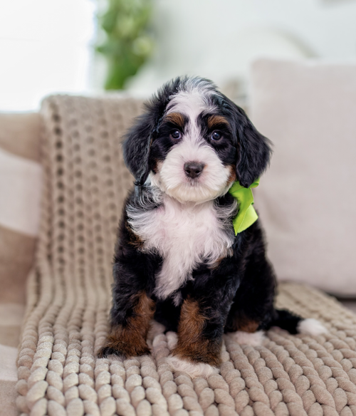 This green female puppy is calm, affectionate, and naturally people-focused. She has been raised in a structured, loving environment that supports healthy development, emotional balance, and an easy transition into her future home.